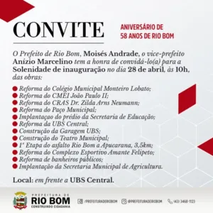 O prefeito de Rio Bom, Moises Andrade (PSD), vai aproveitar as comemorações do aniversário da cidade para entregar uma série de obras importantes. A solenidade acontece no feriado municipal, nesta quinta, em frente à UBS Central, que foi totalmente reformada. Na lista de inaugurações tem melhorias em CMEI, colégio, CRAS e no próprio Paço Municipal, além da entrega do Teatro Municipal e da primeira etapa da pavimentação da estrada Rio Bom/Apucarana, um marco na história da cidade, que reivindicava essa melhoria há décadas.