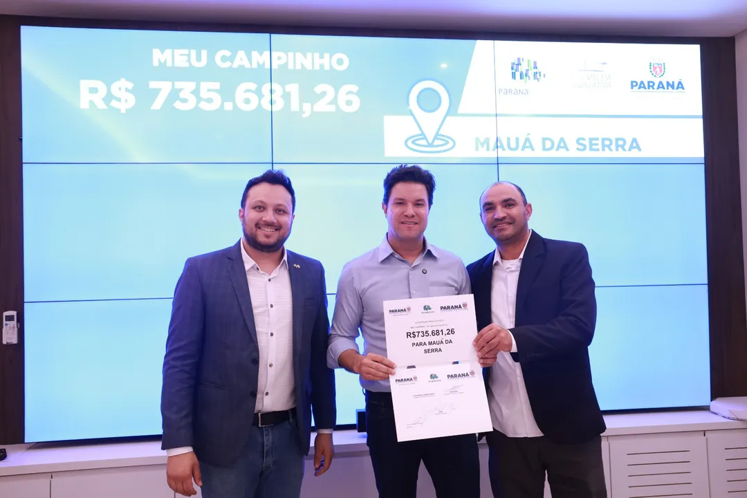 O prefeito de Mauá da Serra, Giva Lopes (União) acompanhou ontem, em Curitiba, assinatura de autorização de licitação para mais um espaço esportivo na cidade com recursos do Governo do Estado. São R$ 735.681,26 para a implantação do Meu Campinho no Loteamento Cidade Mauá. O investimento foi liberado em um pacote de R$12,8 milhões autorizado pelo secretário das Cidades, Guto Silva, para sete municípios. Os recursos são provenientes de transferências voluntárias e contemplam obras de pavimentação, construção de abrigos de ônibus, aquisição de equipamentos rodoviários e implantação de espaços de lazer. O prefeito Giva cumpriu, ainda, outras agendas na capital, onde se reuniu com o secretário de Trabalho, Paulo do Carmo, entre outros compromissos.