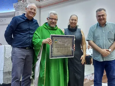 Uma comitiva apucaranense acompanhou, no sábado, a missa de despedida do padre Paulinho Amaral na Igreja Matriz de Colorado. Ao final da celebração, o padre recebeu o título de Cidadão Honorário de Apucarana. O autor da lei, aprovada em 2021, o então vereador e presidente da Câmara, Franciley Preto Godoi (Poim), fez a entrega da placa, acompanhado do secretário de Estado da Saúde, Beto Preto, e da prefeita de Colorado, Rose Chiquim. Padre Paulinho segue agora em missão para o Maranhão. “Estive aqui em Colorado quando o padre Paulinho Amaral assumiu e agora estou novamente presente na sua despedida”, afirmou o secretário Beto Preto que, além de homenagear o sacerdote que atuou por 15 anos em Apucarana — e que batizou seus filhos —, acompanhou o lançamento da Festa do Peão de Boiadeiro de Colorado.