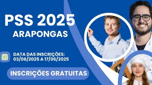 A Prefeitura de Arapongas, por meio da Secretaria de Educação, informa a abertura do Processo Seletivo Simplificado (PSS) 2025. As inscrições são gratuitas e estarão abertas das 9h do dia 03/06/2025 às 17h do dia 17/06/2025. As vagas são para Auxiliar de Serviços Gerais (10 vagas para jornada de 30h), Cozinheiro (10 vagas/30h), Cuidador (05 vagas/30h), Professor (20 vagas/20h), Professor (Área: Educação Física, 05 vagas/20h) e Professor de Educação Infantil (15 vagas/30h). Os salários, com benefícios como auxílio alimentação, vão de R$ 2.349,71 a R$ 3.268,75.