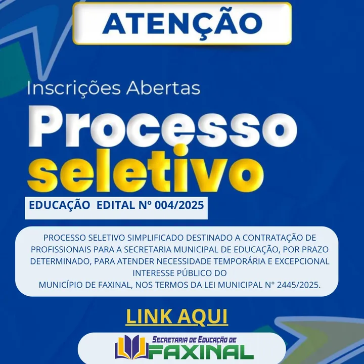 A Prefeitura de Faxinal anunciou a abertura de um novo Processo Seletivo Simplificado (PSS nº 004/2025) para a contratação temporária de profissionais que irão atuar na Secretaria Municipal de Educação. O edital foi publicado na última sexta-feira (31), na Edição 1.941/2025 do Diário Oficial do Município.