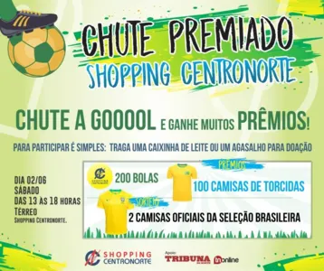 O Shopping Centronorte de Apucarana promove neste sábado (02) um evento beneficente. O piso térreo será palco para a brincadeira “Chute Premiado”, onde os participantes, - crianças de até 12 anos - terão a chance de chutar ao gol e quem acertar ganha brindes para curtir a Copa do Mundo.