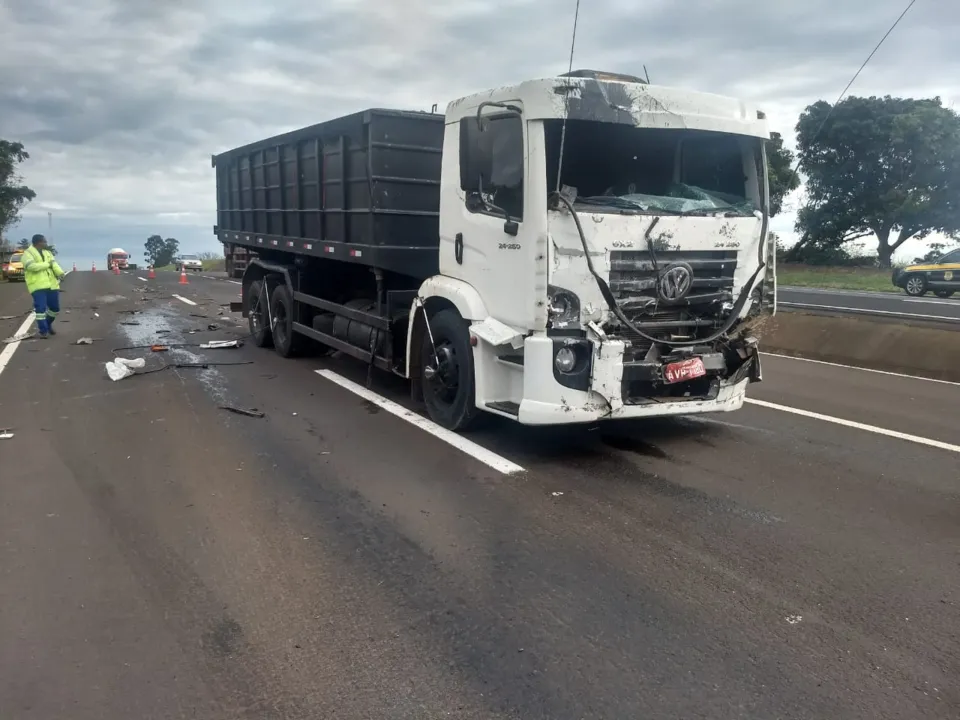 Um trabalhador ficou ferido após acidente entre dois caminhões, na tarde desta sexta-feira (15), na BR-376, em Apucarana. A colisão ocorreu perto do trevo de acesso ao Distrito de Pirapó.