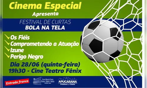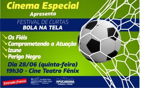 Dando sequencia nas exibições de filmes gratuitos dentro do projeto “Cinema Especial”, que visa à valorização da produção audiovisual brasileira, a Prefeitura de Apucarana por meio da Secretaria Municipal de Promoção Artística, Cultural e Turística (PROMATUR), exibirá nesta quinta-feira (28), no Cine Teatro Fênix, a partir das 19h30, festival de curta-metragem “Bola na Tela”.