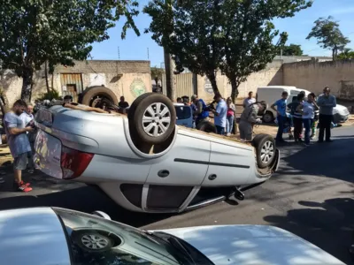 Uma colisão de veículos seguida de capotamento de um dos carros envolvidos no acidente na Rua Nova Ukrânia, próximo ao minipresídio, na zona sul de Apucarana, mobilizou equipe de socorristas do Samu e Corpo de Bombeiros de Apucarana por volta das 11h40 desta quarta-feira (4).