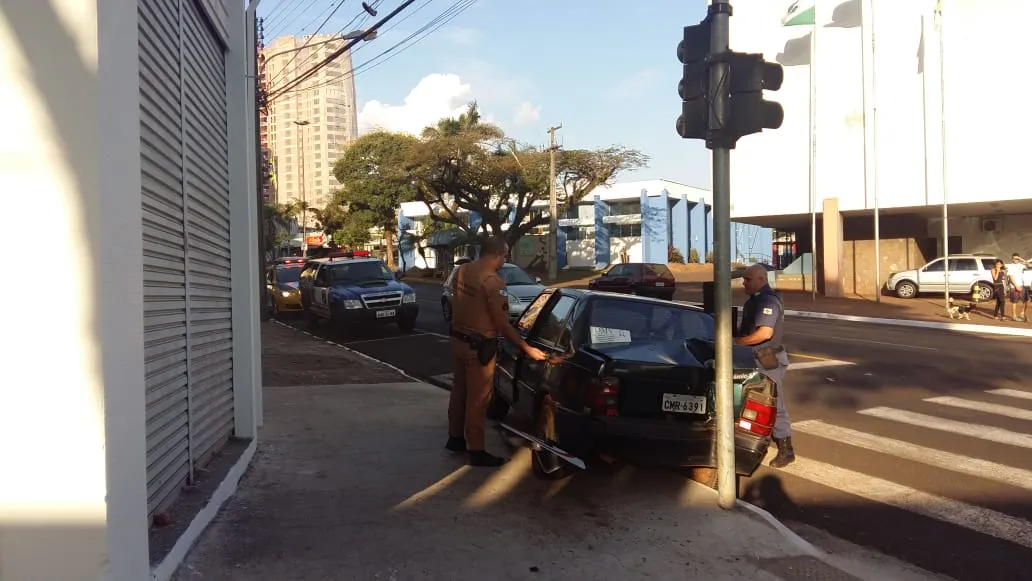 Um veículo Fiat Prêmio com placas de Apucarana , na tarde de domingo (29), por volta das 16h30, desceu desgovernado cerca de 50 metros, de ré na avenida Corifeu de Azevedo Marques, até a esquina da Rua São Jerônimo, e se chocou contra o poste do sinaleiro perto da prefeitura.