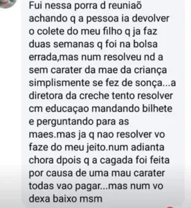 No texto, postado no Facebook, a mulher se identifica como mãe de uma criança, aluna do CMEI. Ela conta que a peça teria sido colocada por engano na mochila de outra criança, o que deixou a mulher muito irritada.