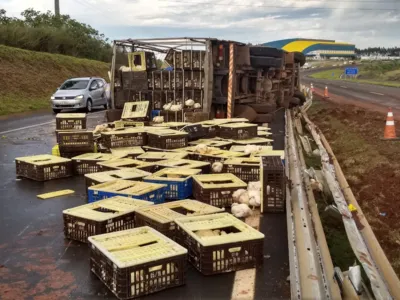 A carga de frango que era transportada por um dos caminhões ficou sobre a pista. Alguns dos animais também morreram com o impacto.