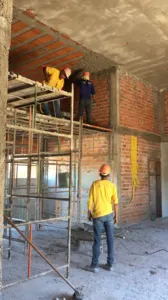 Já foram concluídas as etapas da fundação, pilares, vigas, laje e cobertura. No momento estão executando os revestimentos internos, com chapisco e reboco.