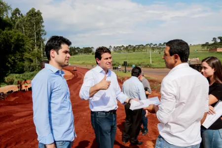 O prefeito em exercício Júnior da Femac vistoriou as obras de duplicação dos 11,6 quilômetros do Contorno Sul de Apucarana. Acompanhado do vereador Mauro Bertoli e do presidente do Distrito Industrial Sul, Adan Lenharo, ele foi recebido pelos engenheiros da CCR Rodonorte, Luiz Carlos Fernandes e Melissa Maronezi, que detalharam o projeto, com ênfase ao chamado viaduto da estrada de Rio Bom, na interseção da Rua Cristiano Kussmaul com o KM 237 da BR-376 (Rodovia do Café).