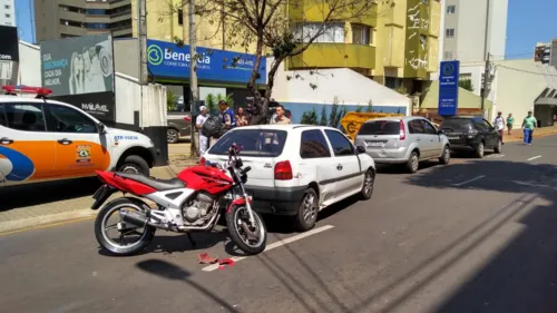 Uma colisão de trânsito envolvendo três carros e uma motocicleta deixou um ferido na manhã desta quinta-feira (28) no centro de Apucarana, na Rua Doutor Munhoz da Rocha.