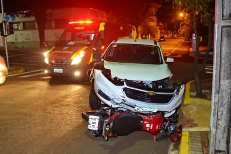 Um carro e uma moto colidiram na noite desta terça-feira (14) na esquina das ruas Miguel Simião e Nagib Daher, no centro de Apucarana. Uma mulher ficou ferida e foi encaminhada ao hospital. O cruzamento recebeu, há menos de uma semana, um novo semáforo.