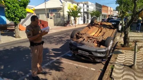 Um carro capotou no centro de Apucarana na manhã de hoje (30).O veículo foi parar em uma vaga, e ficou com as rodas para cima. O acidente aconteceu na Rua Professor João Cândido Ferreira, por volta das 06h10.