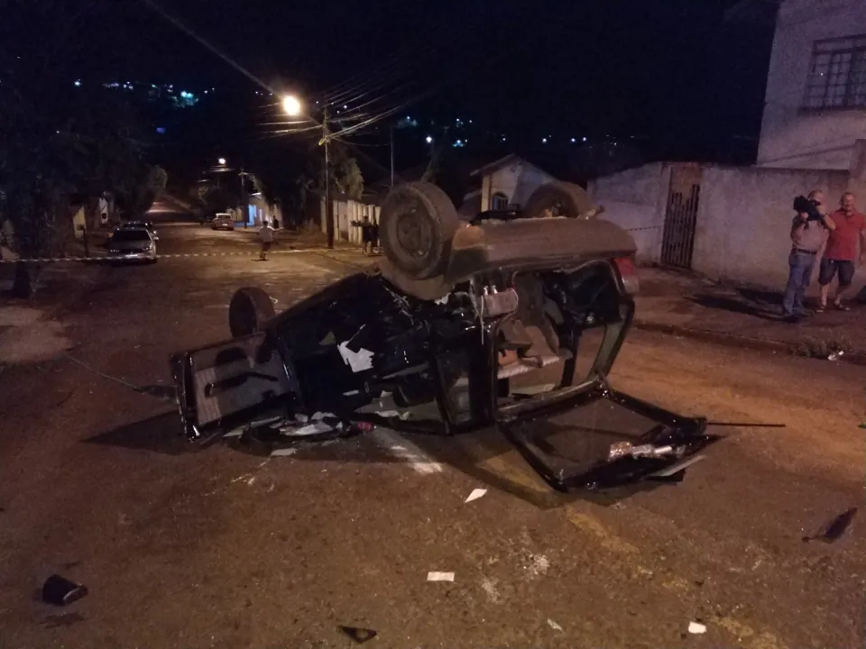 Autor Uno ficou de ponta cabeça após bater contra um Argo, na noite deste domingo (16), em Apucarana. Foto: Cindy Santos) - Foto: Reprodução