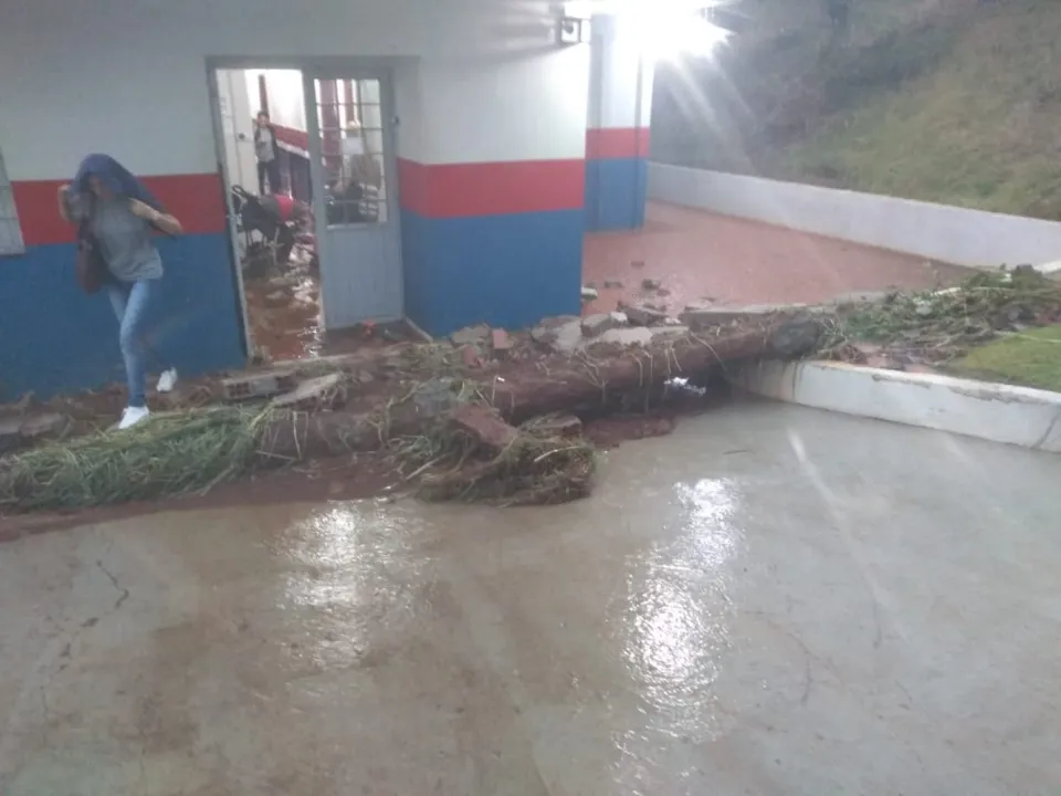 Em um dos CMEIs, o muro dos fundos foi derrubado pela força da enxurrada que também derrubou uma árvore no pátio.