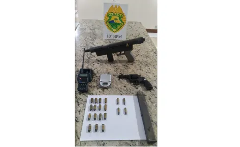 A Rotam foi até a casa do suspeito e a mãe do rapaz autorizou a equipe realizar buscas. Os policiais encontraram no forro da lavanderia da residência, em uma bolsa, uma submetralhadora Beretta .40, fabricação italiana, com 15 munições, um revólver calibre 32, um rádio transmissor que estava ligado na frequência da PM de Apucarana e uma balança de precisão.