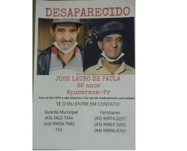 Nesta quinta-feira (4), completa 50 dias do desaparecimento de José Lauro De Paula de 69 anos. O idoso de Apucarana, saiu de um pensionato, que fica na região do Clube 28, onde morava, no dia 13 de janeiro e até agora não retornou ou deu notícias.