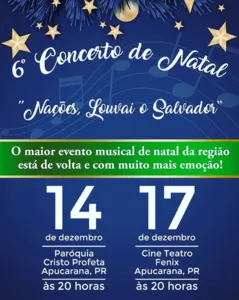 O 6º Concerto de Natal “Nações, Louvai o Salvador” acontece no próximo dia 14, na Paróquia Cristo Profeta às 20 horas. Já no dia 17 de dezembro, a apresentação será no Cine Teatro Fênix às 20 horas. A entrada é gratuita e o evento segue todas as regras sanitárias para evitar a propagação da Covid-19.