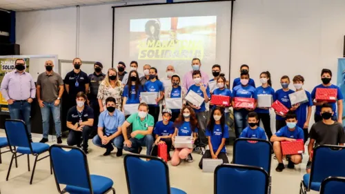 Vinte alunos apucaranenses pertencentes ao Programa Aprender e Jogar, projeto esportivo e social do Sesc Paraná, receberam pares de tênis na sede da instituição em Apucarana. O evento fez parte pela 2ª edição da Maratona Solidária, realizada recentemente de forma virtual. Ao todo foram beneficiados 60 alunos de Apucarana, com 20 deles recebendo os pares de tênis nesta quarta-feira (10).