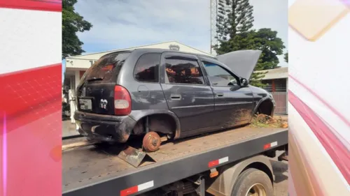 Chegando no local da denúncia, a equipe policial verificou que o Corsa estava com alerta de furto no dia 13 de maio. O carro se encontrava sem as rodas, bateria e rádio.