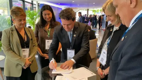 O prefeito Junior da Femac assinou a adesão ao lado do prefeito de Petrópolis (RJ), Rubens Bontempo; e da prefeita de Pelotas (RS), Paula Mascarenhas