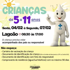 A imunização para a faixa etária já está disponível para aplicação no Lagoão e segue até segunda-feira (7), das 8h30 às 17h. A criança precisa estar acompanhada dos pais ou responsável. É preciso levar a carteira de vacinação, documento de identificação da criança, documento de identificação com foto do responsável, além do comprovante de residência, com no máximo 90 dias.