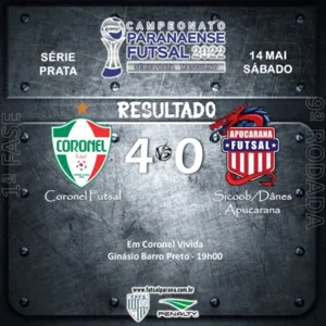 O Apucarana Futsal segue sem vencer fora de casa na Série Prata do Campeonato Paranaense. Em jogo válido pela 9ª rodada do campeonato, a equipe visitou o Coronel Futsal, no Ginásio Barro Preto, e foi derrotada por 4 a 0.