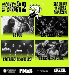 Apucarana (PR) recebe neste sábado (8/11) a segunda edição do Festival Conexão Sonora com a participação de quatro bandas independentes. O evento começa a partir das 17 horas, no O Armazém, na Rua Demétrio Santos Moreira, 251, centro.