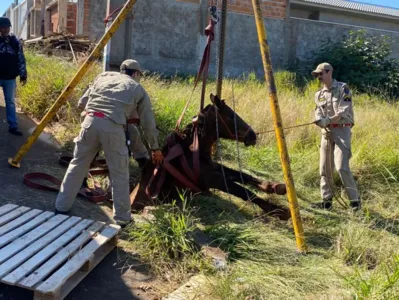 Moradores do Residencial Veneza, em Apucarana, acionaram o Corpo de Bombeiros na manhã desta segunda-feira, 22, para realizar o resgate de um cavalo que caiu dentro do buraco de um bueiro, na Rua Maria André da Silva.