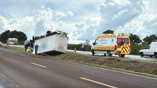 Um caminhão-baú capotou no km 229 da BR-376, sentido Apucarana a Cambira, na tarde desta segunda-feira (22), nas proximidades do Distrito do Pirapó, em Apucarana. Havia duas pessoas no veículo, mas somente o motorista ficou preso às ferragens.