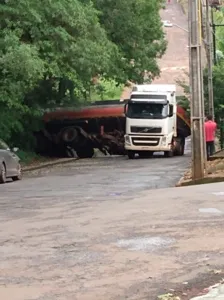 Durante o temporal registrado na noite de sábado (23), em Apucarana, um caminhão-tanque carregado com 50 mil litros de combustível perdeu a direção e teve a parte traseira quase tombada na Rua Lírio, no Jardim das Flores.