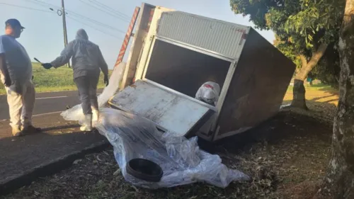 Caminhão frigorífico carregado tomba na BR 369, em Apucarana