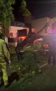 O Corpo de Bombeiros foi acionado por volta das 22h. Com o impacto da batida, parte da árvore ficou enroscada na carroceria do veículo, gerando risco de queda da estrutura sobre o próprio caminhão e imóveis próximos.