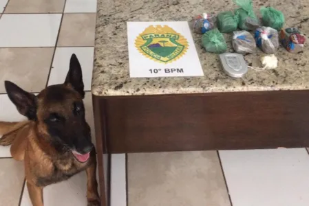 A Polícia Militar (PM) de Apucarana apreendeu 815 gramas de maconha. O cão de faro Nino encontrou a droga escondida dentro de um tronco de árvore, no quintal de uma casa, no Núcleo da Fraternidade. Crack também foi apreendido, durante cumprimento de mandado de busca na tarde de quinta-feira (16).