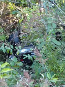 O carro caiu em um barranco e só parou entre as árvores. O motorista que causou o acidente não parou para prestar socorro.