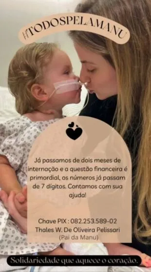 Nas redes sociais, a mãe de Manu divulgou um vídeo em que relata todo o drama vivido pela família nesse período. "Tudo começou com uma internação em Maringá. Em menos de uma semana, precisamos realizar uma transferência aérea com urgência para Unidade de terapia Intensiva (UTI) no hospital Sírio-Libanês, em São Paulo, devido ao agravamento do quadro. Nossa pequena precisou ficar 24 dias em um sistema de respiração extra corpórea para que seu pulmão começasse a se recuperar", conta.