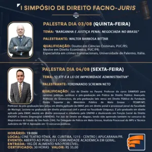 O Cine Teatro Fênix, que é administrado pela Secretaria de Cultura e Turismo de Apucarana, norte do Paraná, irá sediar um evento gratuito voltado à área do Direito nesta semana. Para participar do simpósio jurídico basta realizar uma inscrição através do link: https://docs.google.com/forms; e na entrada da palestra doar 1 kg de alimento não perecível.