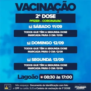 Sábado, domingo e segunda-feira, Apucarana vai aplicar a segunda dose da Coronavac e Pfizer para as pessoas que têm essa imunização agendada para os dias 11, 12 e 13 de setembro, respectivamente. As pessoas com 18 anos ou mais que ainda não tomaram a primeira dose também podem receber a vacina contra a Covid-19 nos próximos três dias.