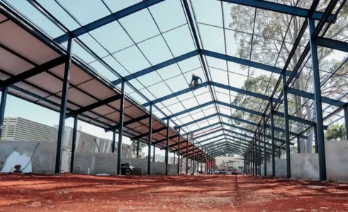 A empresa contratada pelo Município iniciou nesta semana a implantação da cobertura no Espaço das Feiras. Ao todo, serão colocadas 400 placas de um material especial, que diminui o ruído da chuva e também a propagação do calor. A obra, que está sendo erguida ao lado do Cemitério Municipal da Saudade, será um ambiente para feiras, gastronomia e lazer.