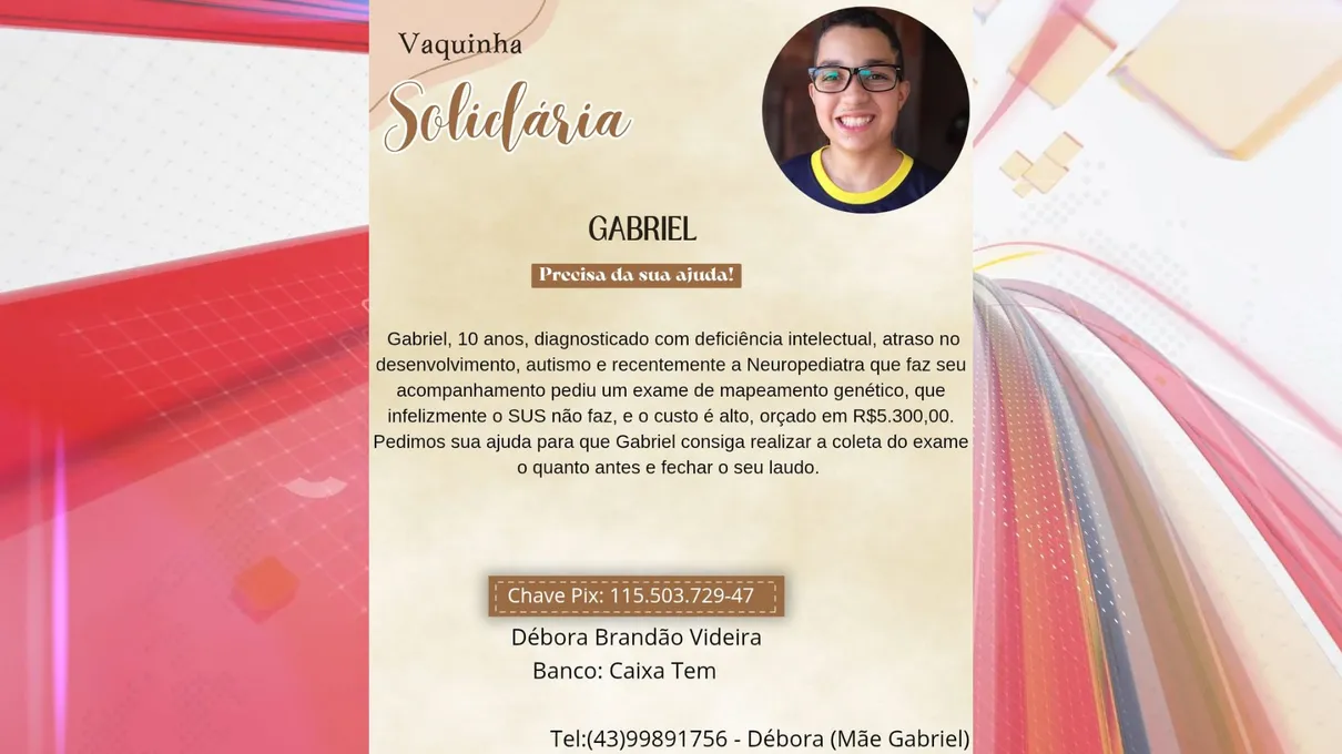 Por isso, eles estão realizando uma vaquinha solidária com o objetivo de arrecadar o valor de R$ 5.300, montante necessário para a realização do exame. Para ajudar, basta enviar qualquer quantia pelo PIX 115.503.729-47, em nome de Débora Brandão Videira, mãe de Gabriel.