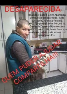 A moradora de Apucarana, Geise Aparecida Leme, de acordo com informações do Facebook de sua mãe, Odete Peres Leme, está desaparecida desde o dia 10 de julho. Ela e a mãe estavam passeando em Osasco, interior de São Paulo, quando a mulher sumiu. Segundo informações, ela estava no Jardim Califórnia.