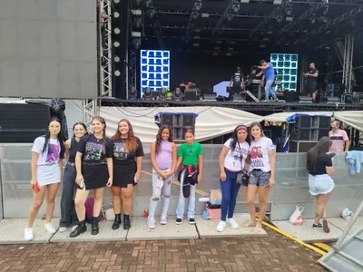 "Trouxe uma caneca personalizada que eu mesma produzi. Espero conseguir entregar", relata a fã. "Elas são maravilhosas, incríveis demais. As músicas são maravilhosas", completa Michele.