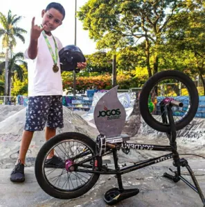 Theo Marques, de 8 anos, de Apucarana, foi destaque neste final de semana em Guaratuba, nos Jogos de Aventura e Natureza na modalidade de BMX Freestyle Park