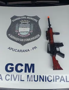 A Guarda Civil Municipal (GCM), de Apucarana, apreendeu uma réplica de fuzil com um grupo de adolescentes nas proximidades de uma escola, após uma denúncia de suposto porte de arma de fogo. O caso ocorreu em uma quadra de vôlei lateral à unidade de ensino, onde os jovens foram abordados pelos agentes após um alerta feito pela diretora da instituição e por um vigilante local.