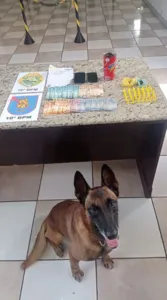 Segundo a equipe policial, foram localizados no interior da residência duas porções de maconha (11,4g), dinheiro e contabilidade de tráfico. No quintal, 42 pinos de cocaína (29,3g).