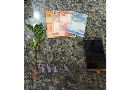 O jovem contou que o celular seria da irmã, que ela utilizava apenas como lanterna, pois estava sem o chip. O rapaz disse que os pés de maconha seriam dele. Na casa do suspeito, no quintal, a equipe encontrou dois pés de maconha pequenos e no quarto do suspeito, quatro pinos com cocaína.