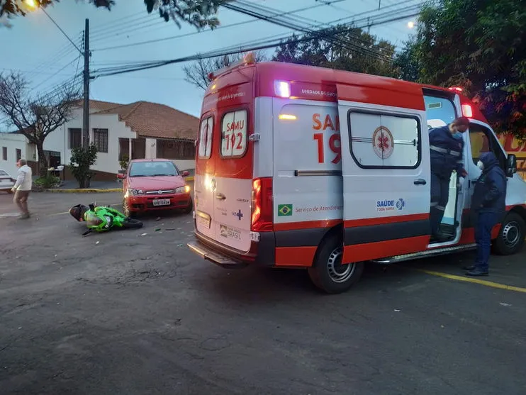 Uma batida entre uma motocicleta Kawasaki e um Fiat Siena aconteceu no final da tarde desta segunda-feira (28), no cruzamento da Rua Ponta Grossa com a Rua Erasto Gaertner, em Apucarana