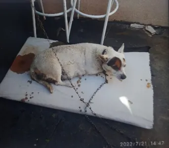 A cachorra estava amarrada com correntes e em trabalho de parto há dois dias