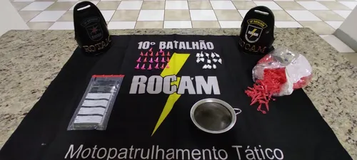 Durante a revista pessoal, os policiais encontraram no bolso do suspeito um pote plástico contendo 10 porções de cocaína, embaladas em pinos cor-de-rosa. Buscas realizadas no quintal da casa, próximo ao local onde o homem estava inicialmente, revelaram outro pote com mais 10 pinos e 13 porções da mesma droga em embalagens plásticas. Além disso, a equipe localizou uma sacola contendo uma grande quantidade de pinos vazios (novos) e uma peneira, indicando o fracionamento e preparo do entorpecente no local.