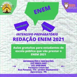 A Paróquia Cristo Rei, localizada no Jardim Diamantina em Apucarana, está com inscrições abertas para as aulas do primeiro Intensivo de Redação para o Enem, destinado a estudantes de escola pública que vão fazer a prova este ano.